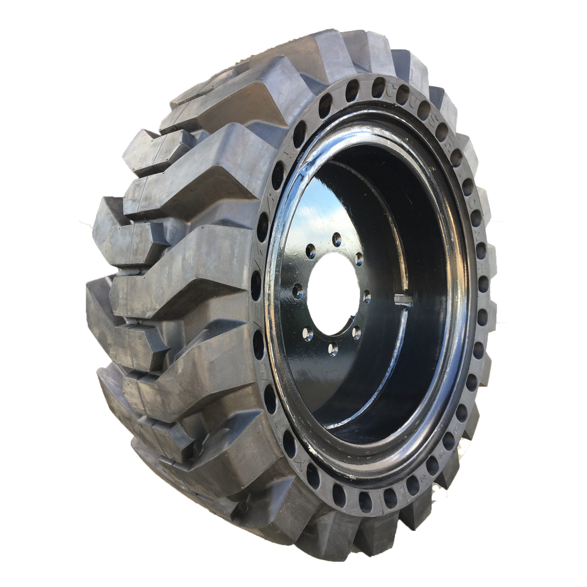 Our premium flat-proof solid skid steer tires are engineered with the highest quality rubber compounds to give superior and lasting performance even in harsh and demanding environments. These tires come with deep, aggressive lugs which give high traction that is needed to handle tough muddy applications. Its extraordinary design has directional treads that act as mud breakers for easy disposal of mud and water and it works excellently in shock absorption.